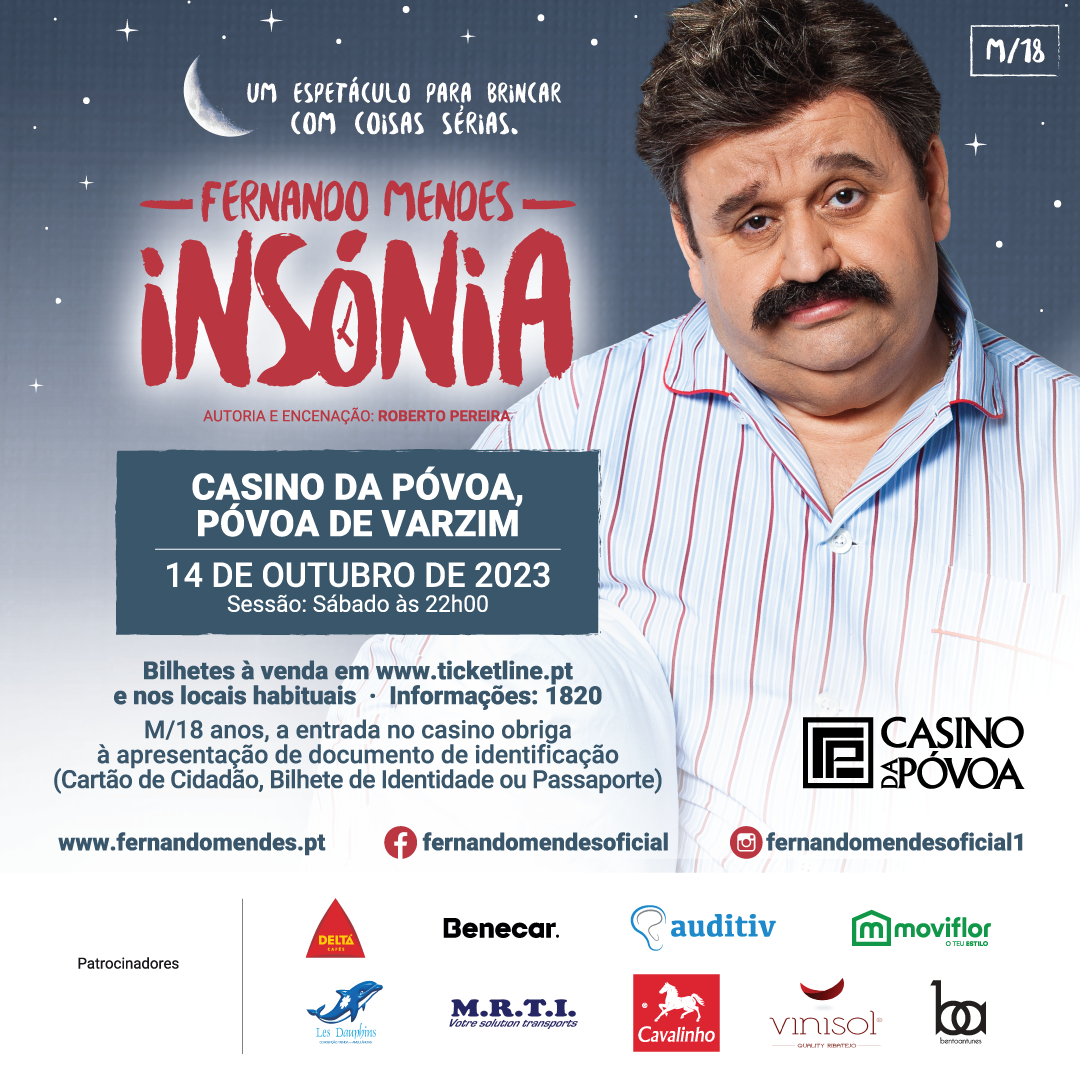 #CasinoDaPóvoa #PóvoaDeVarzim #FernandoMendes #Teatro #UmEspetáculoParaBrincarComCoisasSérias #Comédia #Artista #OPreçoCerto #Espetáculo #EspetáculoInsónia #Insónia #CustódioReis #salaodouro #Setembro2023 #Espetaculo