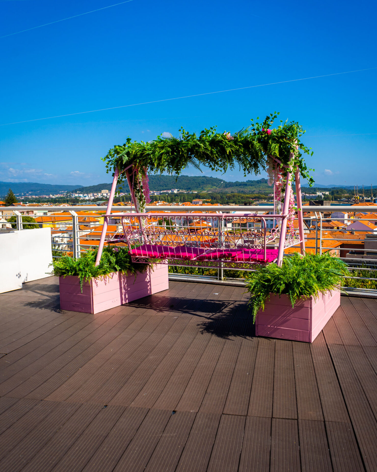 O baloiço é cor de rosa e tem uma decoração floral que, complementada com a paisagem vianense, se torna no spot perfeito para um momento de pausa — e para uma fotografia para as redes sociais também, já que dali é possível ver até o Rio Lima.