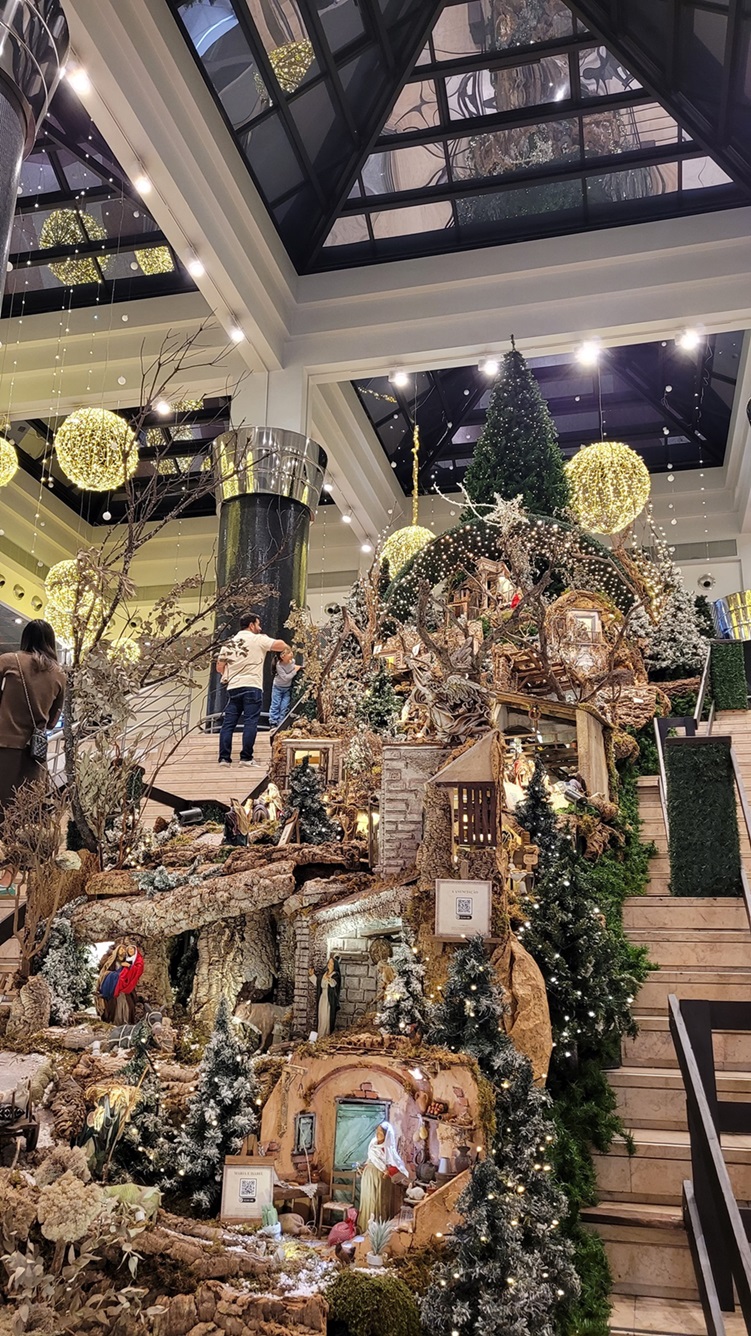 O icónico presépio do Amoreiras, da autoria da designer Cláudia Perdigão, volta a surpreender com figuras detalhadas, muitas delas mecânicas, que recriam a história do nascimento de Jesus num cenário que combina tradição e modernidade. Esta obra, já reconhecida por muitos, é anualmente renovada com novas personagens e elementos que capturam o verdadeiro espírito natalício. Situado na imponente escadaria central, o presépio inclui placas informativas e QR codes que permitem a narração da obra com detalhe, tornando o conteúdo acessível a visitantes com limitações de mobilidade ou deficiência visual e enriquecendo a experiência de todos.