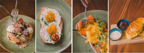 O brunch é à carta, pelo que não há menus pré-definidos. O cliente escolhe a seu gosto e combina segundo o seu desejo. Há croissants, granola, nachos e húmus. Como seria de esperar, os ovos têm lugar primordial e podem ser servidos estrelados ou escalfados, acompanhados de bacon ou de salmão fumado; ou ainda em opção vegetariana, enriquecida por abacate, tomate cherry e cogumelos Portobello. O restaurante prepara ainda várias saladas diferentes, bem como delícias no pão: tosta mista, mini hambúrgueres, bagels de salmão com queijo creme, ou bagels com guacamole e chips.