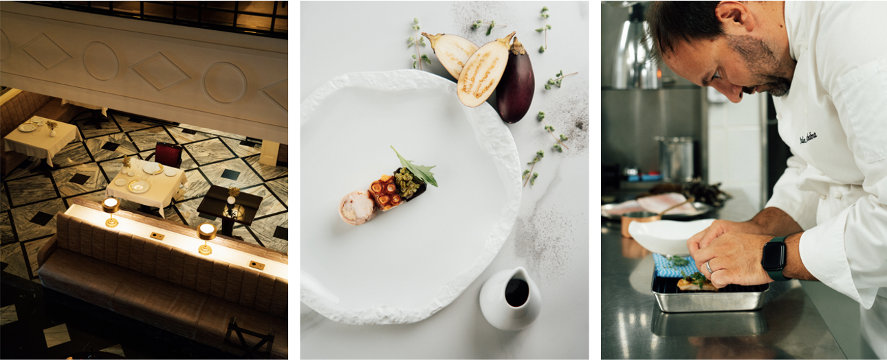 Dos pratos que compõem o novo menu destaca-se o Atum Rabilho, cereja, tamarindo, uma homenagem ao arquipélago dos Açores – onde a cultura piscatória constitui parte da essência da região – e também à bravura dos seus pescadores. Daí viaja-se até aos viveiros de ostras de Aveiro, rodeados pelos canais da ria, com a Ostra Especial Ilha dos Puxadoiros, crème fraîche, morango verde. Ruma-se então até ao sul, mais precisamente até à Costa Vicentina com o Carabineiro, rábano, consommé perfumado com eucalipto, que, pela proximidade com o oceano, se distingue pela diversidade de produtos e junta ingredientes provenientes tanto da terra, como do mar.
